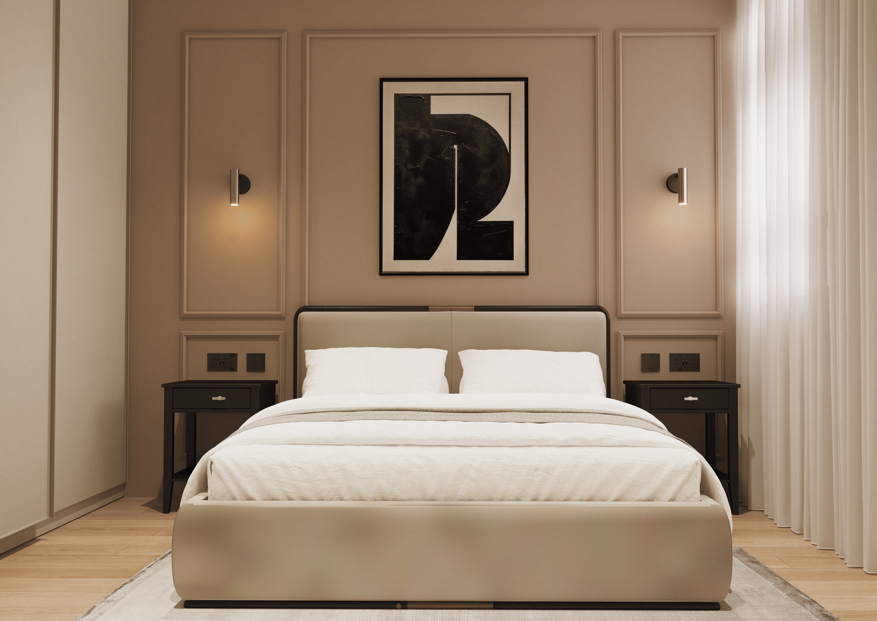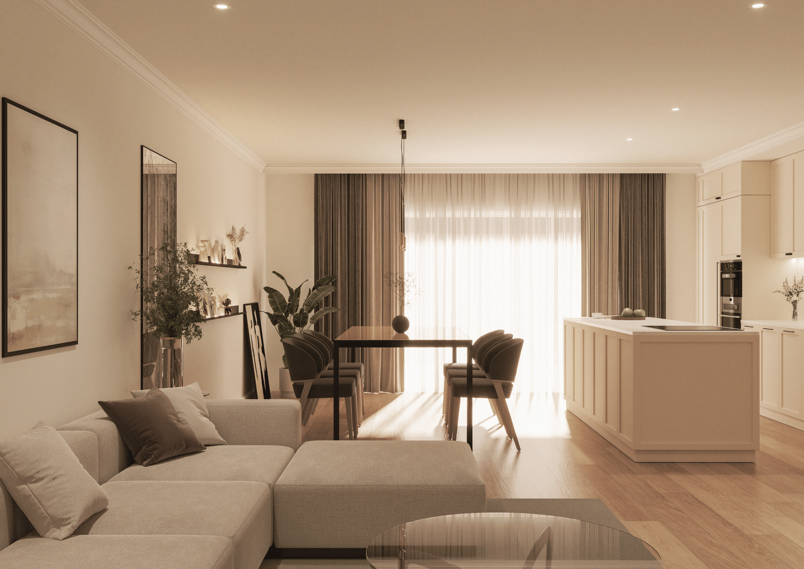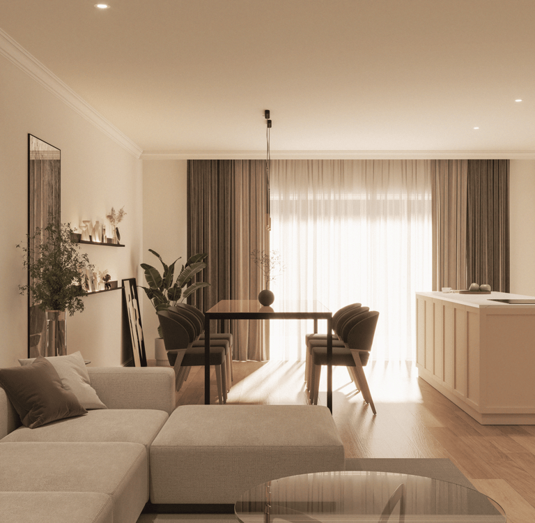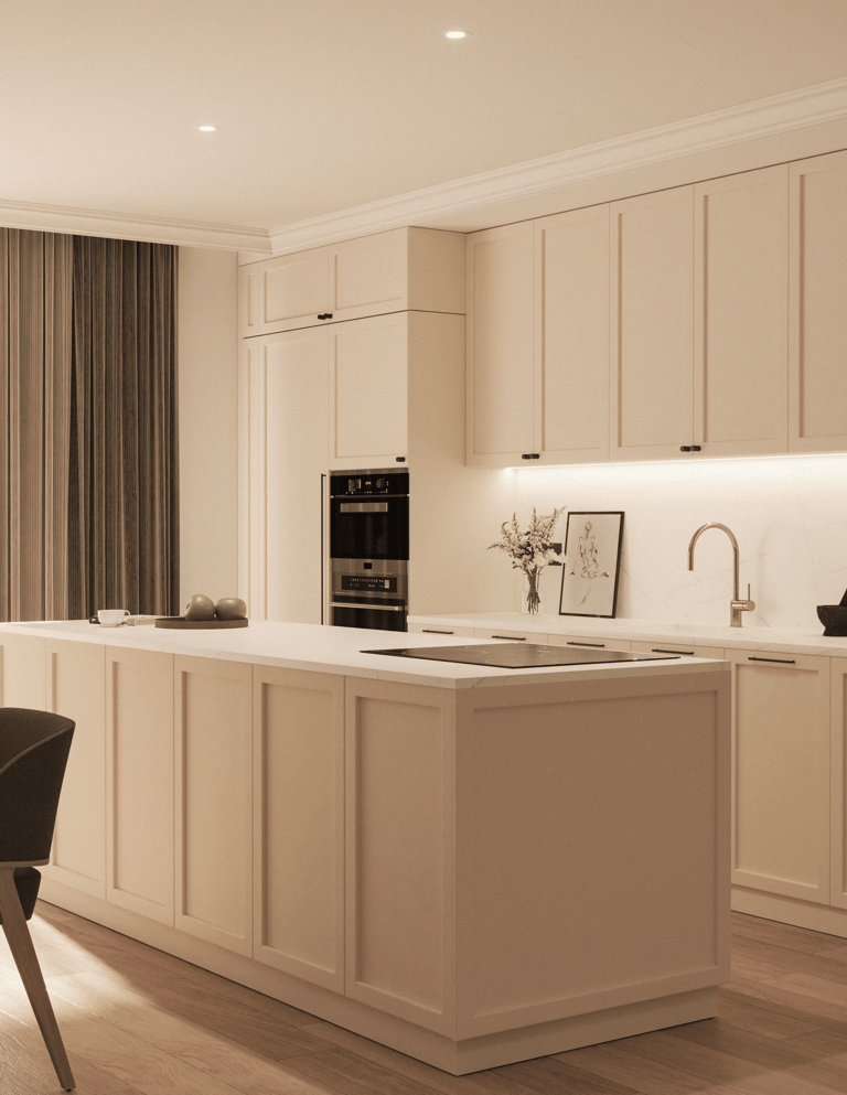 This residential apartment in Swatar adopts a modern-classical design language, defined by clean lines, subtle detailing, and a cohesive neutral palette. The interior features tones of beige, cream, taupe, and light oak, contributing to a consistent and balanced aesthetic throughout.