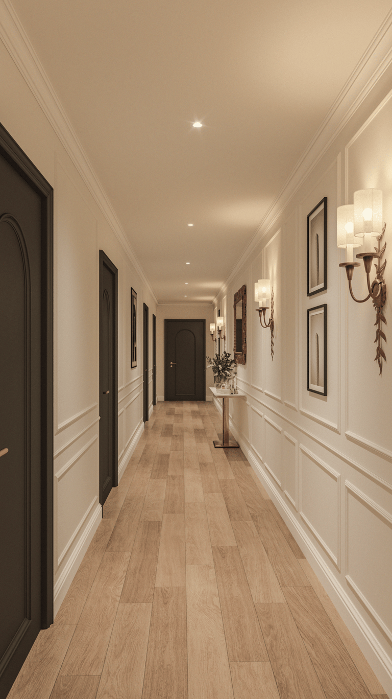 Circulation areas maintain the overall palette and style. The hallway features white panelled walls, matte black doors, brass wall sconces, and light oak flooring creating continuity in material and tone across the space.