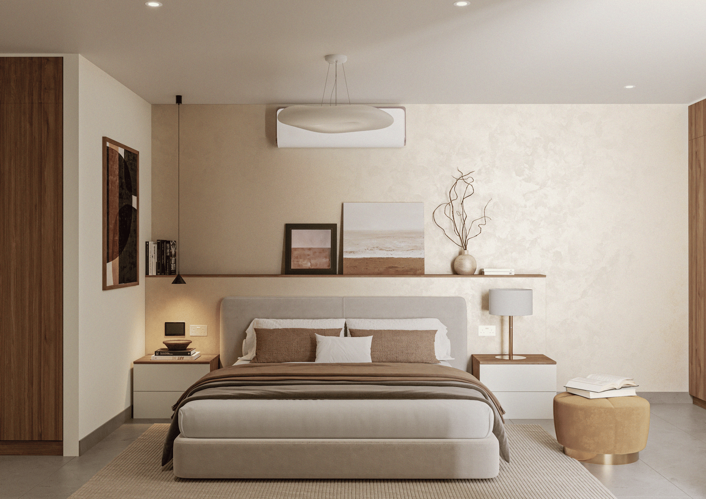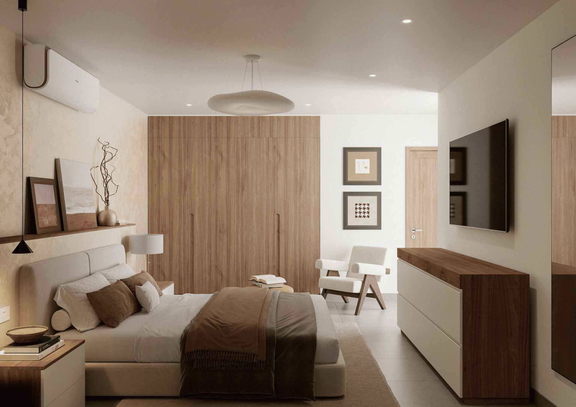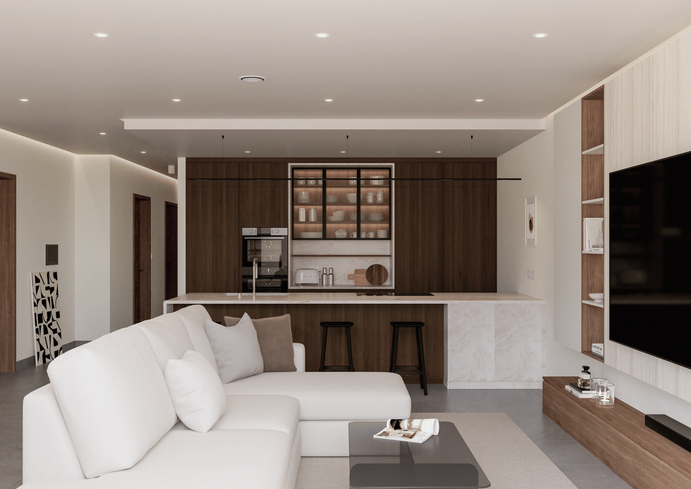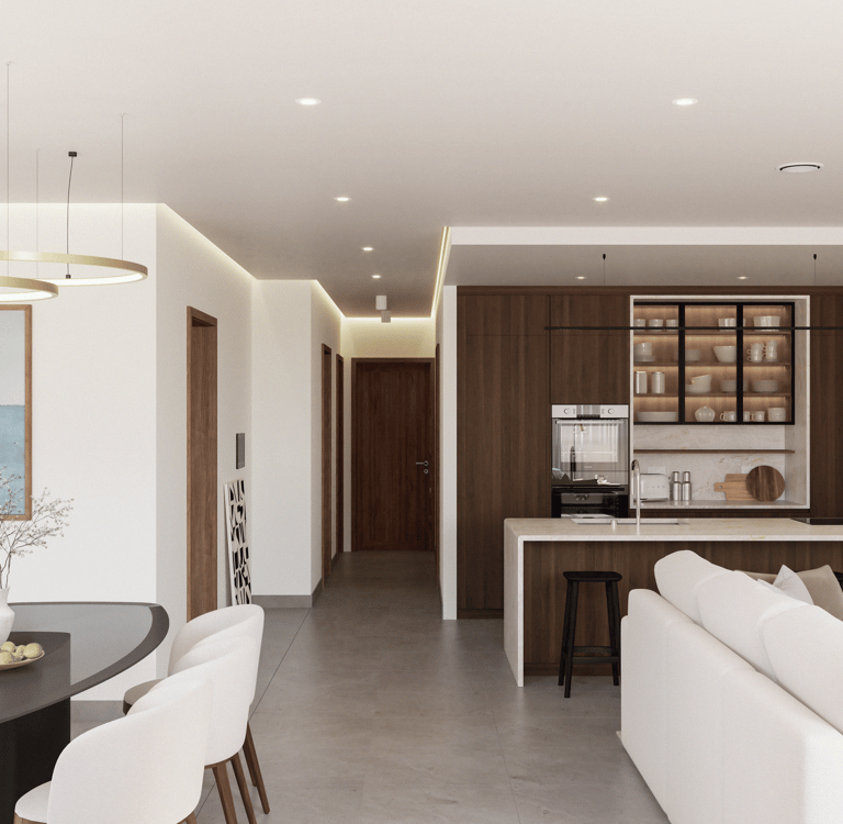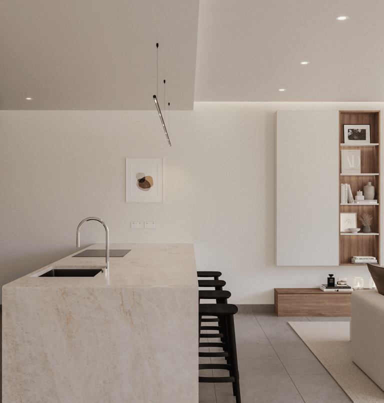 This residential design project in Għargħur, Malta, embraces a harmonious blend of architecture and nature. The maisonette's design respects the contrast between crisp white elements and natural textures, creating a timeless aesthetic. The interior follows a carefully curated palette of neutral tones, where shades of brown, white and grey complement each other to enhance depth and contrast.
