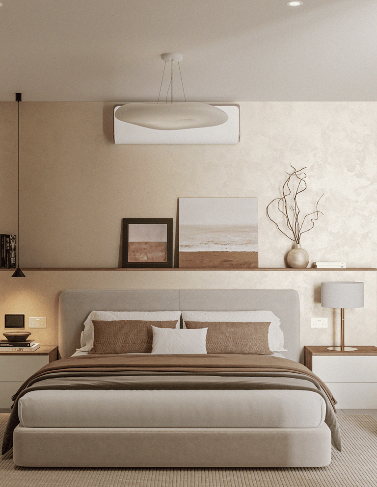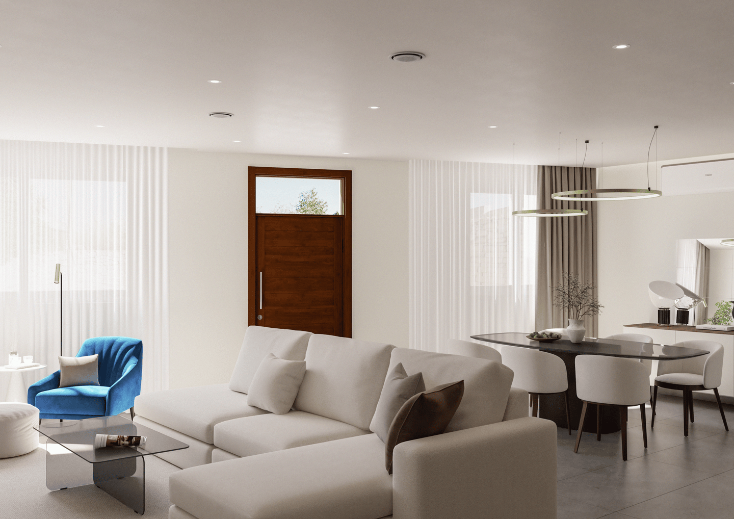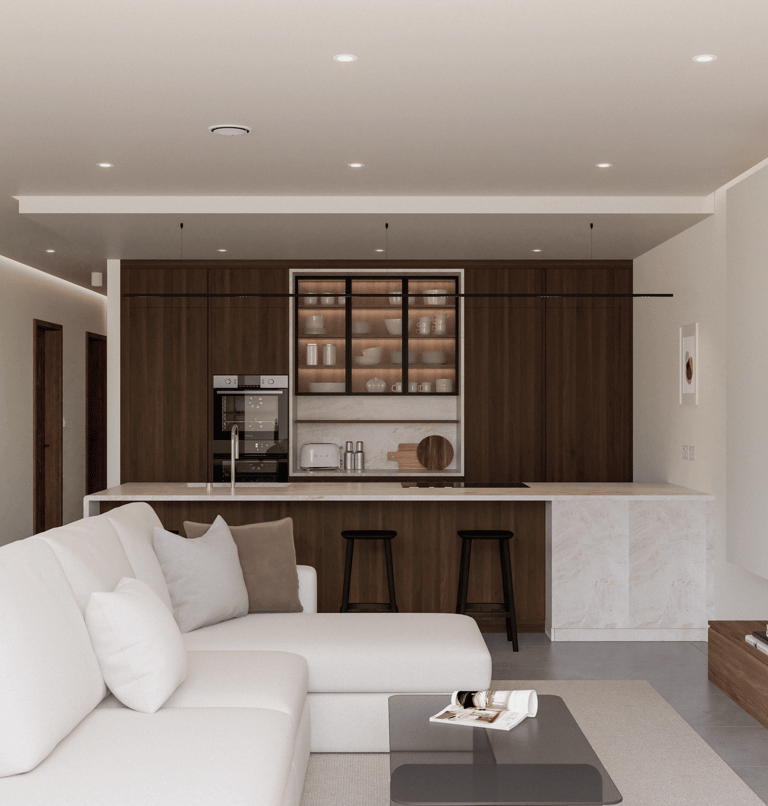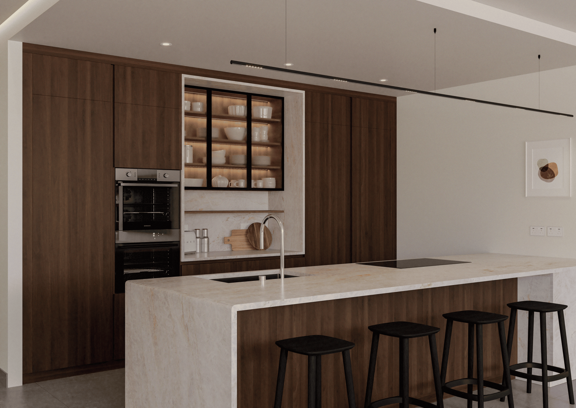 This residential design project in Għargħur, Malta, embraces a harmonious blend of architecture and nature. The maisonette's design respects the contrast between crisp white elements and natural textures, creating a timeless aesthetic. The interior follows a carefully curated palette of neutral tones, where shades of brown, white and grey complement each other to enhance depth and contrast.