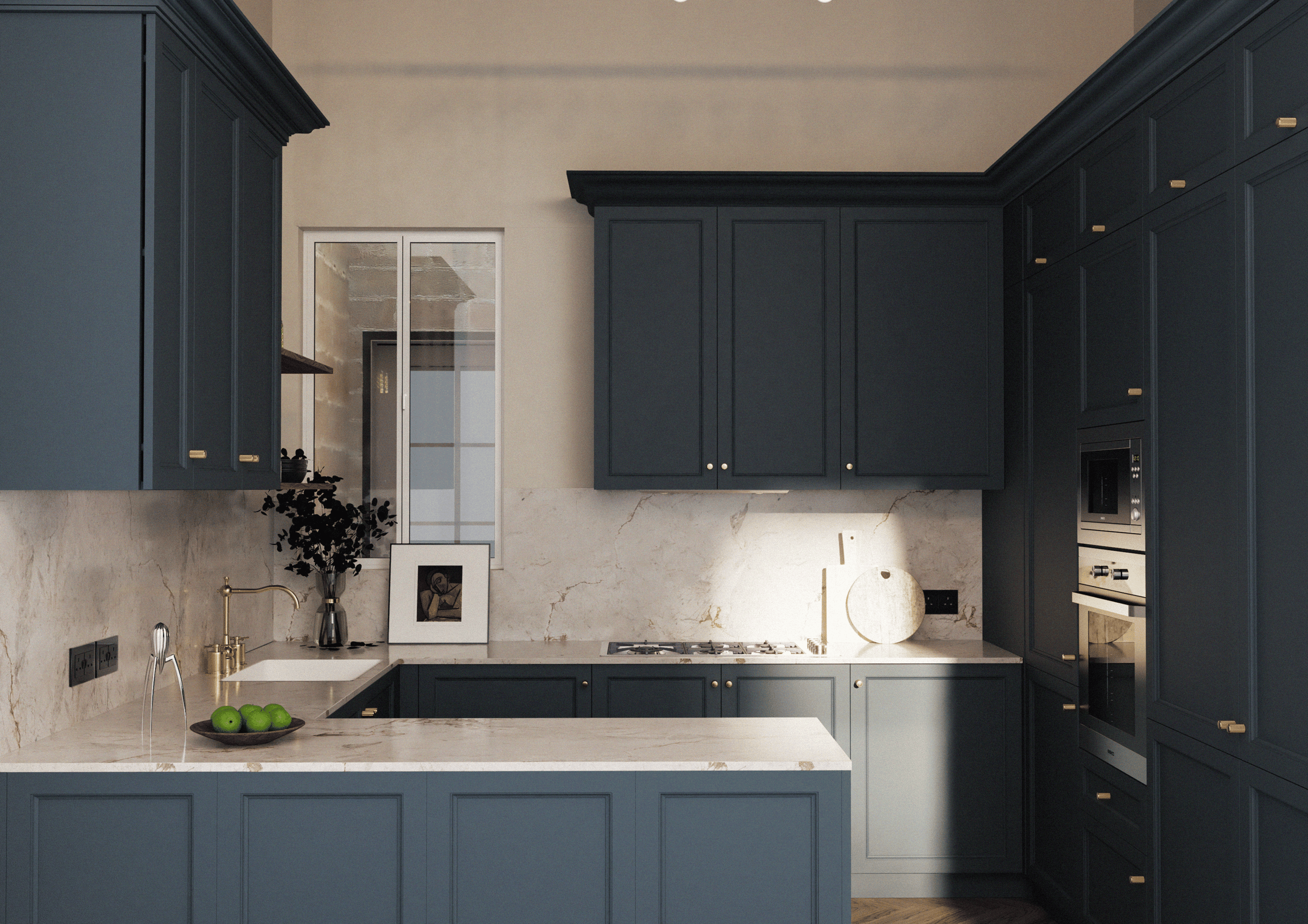 The living and dining areas are warm and inviting, featuring layered lighting and luxurious materials that reflect both old-world charm and modern sensibility. The kitchen stands out with its bold cabinetry in a deep blue tone, brass fixtures, and marble surfaces, combining timeless design with functional elegance. Ultimately, this renovation honours the unique character of Maltese townhouses while creating a serene and stylish living space for modern life.